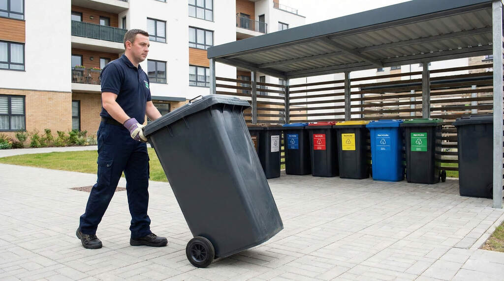 Pünktliches Rausstellen aller Tonnen. Wir sorgen verlässlich für Ordnung und Hygiene an Ihren Müllstellplätzen.